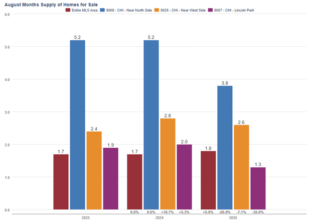 • Near North Side has improved since 2024 but remains tilted toward a Buyers’ Market, but improved through August 2025.