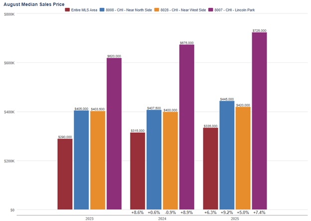 Takeaway: Less dense areas within the city like Lincoln Park remain strong, while dense neighborhoods are weaker relatively, but recovering through August 2025.